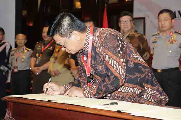 Penandatanganan disaksikan langsung oleh Menteri Dalam Negeri (Mendagri) Tjahjo Kumolo, serta perwakilan dari Kepolisian Republik Indonesia (Polri) dan Kejaksaan Agung RI di sela acara Rapat Koordinasi (Rakor) Pengawasan Penyelenggaraan Pemerintah Daerah Tingkat Nasional (Rakorwasdanas) Tahun 2018 di Birawa Assembly Hall Hotel Bidakara, Jalan Gatot Soebroto Jakarta, Senin (7/5).